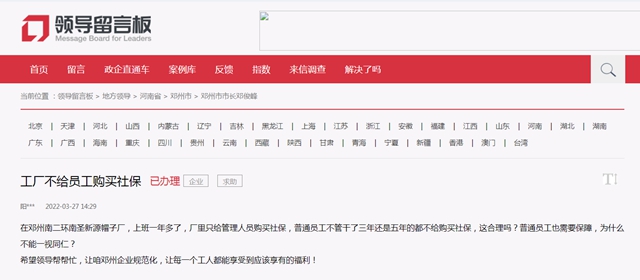 “还不到半个月,这事办了!”上班一年多了,企业没有给购买社保,找企业负责人沟通无果……无奈之下,河南邓州某公司职工李明(化名),在人民网“领导留言板”上留了言,让他没想到的是,这事儿办得“有点快”!