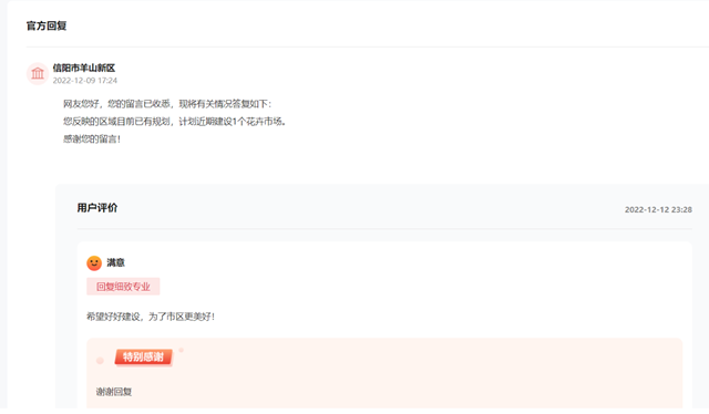 收到留言后,信阳市羊山新区及时进行了回应。回复中称,群众反映的区域目前已有规划,计划近期建设1个花卉市场。