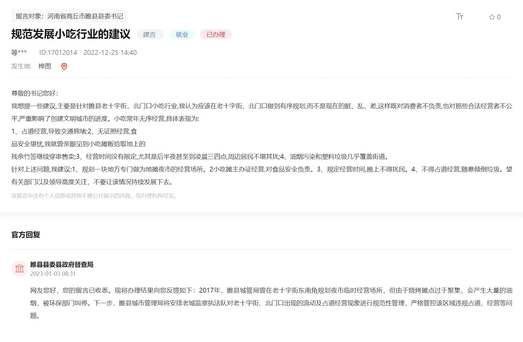 人民建议|河南睢县:采纳群众建议 规范化管理路边摊