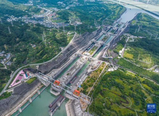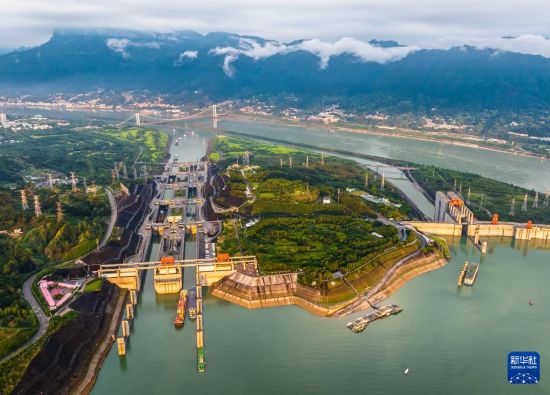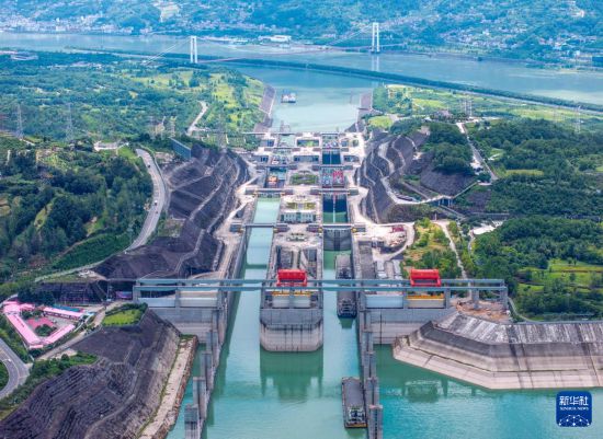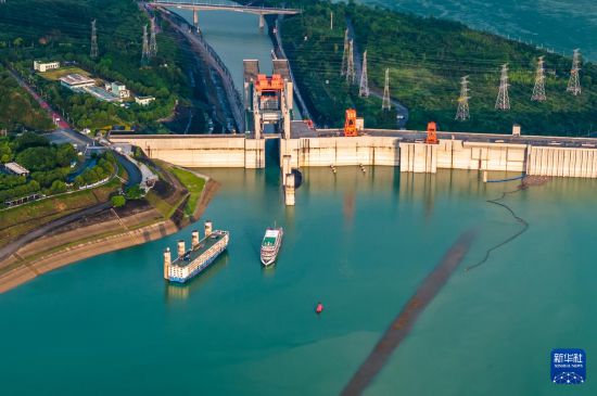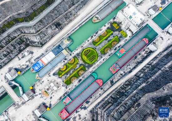 7月1日,在湖北宜昌,船舶有序通过三峡双线五级船闸和升船机(无人机照片)。