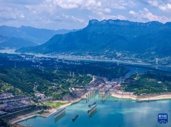 7月1日,在湖北宜昌,船舶有序通过三峡升船机(无人机照片)。