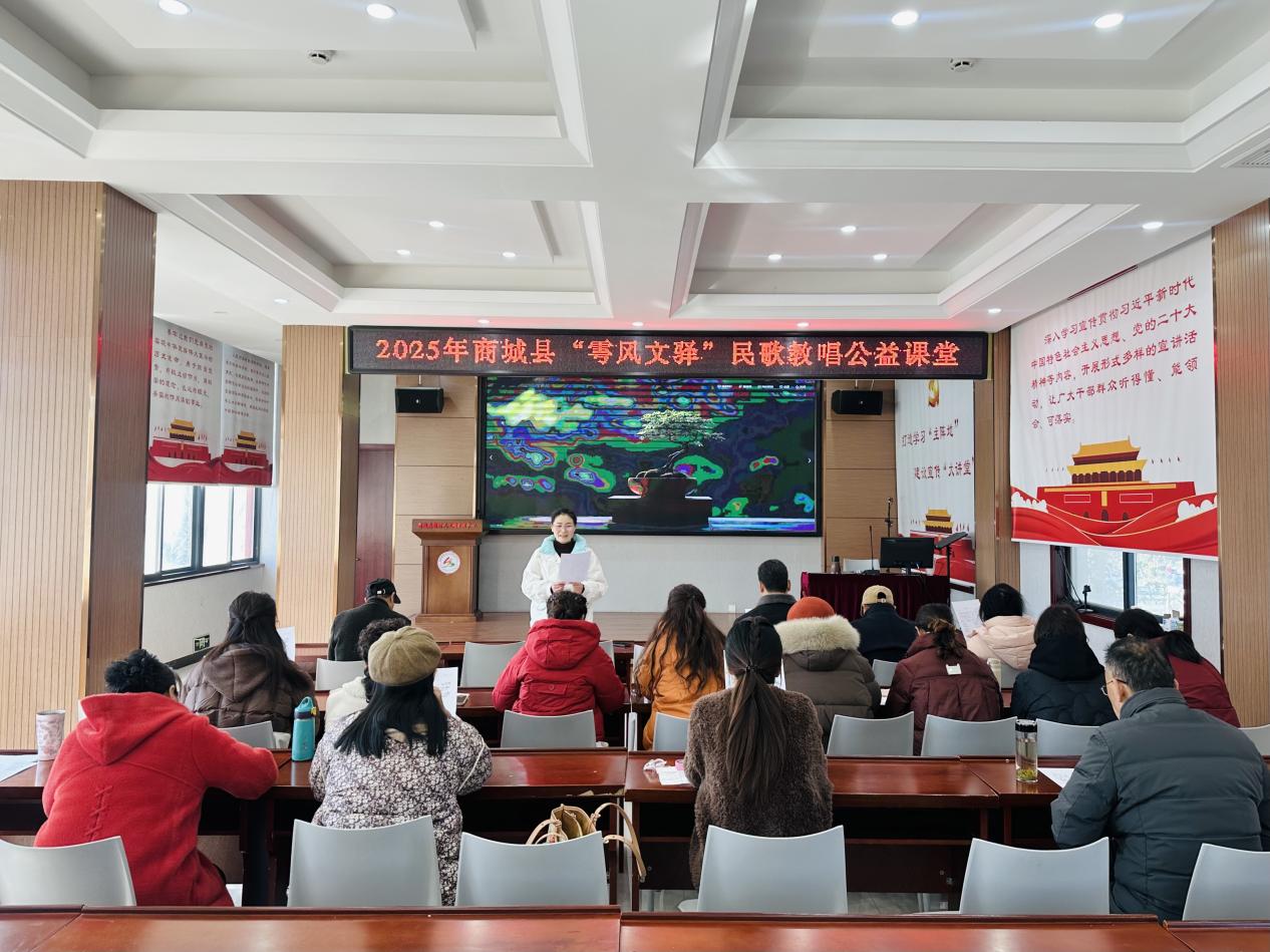 近日,在商城县新时代文明实践中心“雩风文驿”公益课堂内,高亢悠扬的歌声此起彼伏:“哎嗨哟,那个车水呀,薅秧忙啰喂……”商城民歌市级代表性传承人李明凤正逐句示范,从吐字发音到声调转换,细致讲解方言咬字特点,台下几十位学员神情专注,跟随节拍大声歌唱。