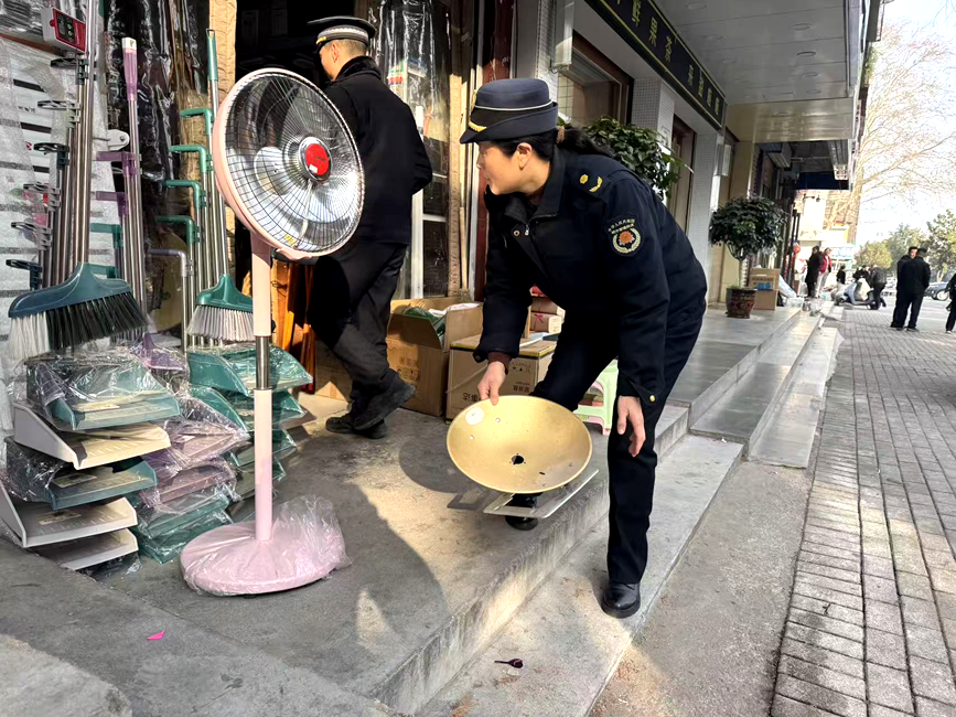执法人员提醒商家切勿在门前堆放杂物。蔡昀贝摄