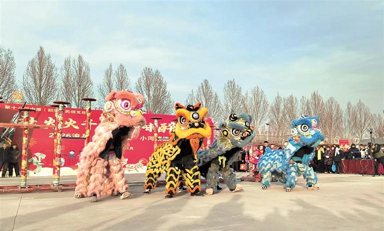 现场,来自小河镇9个文化合作社的社火队伍依次登场。伯僚村舞狮队的“雄狮”威武灵动,在铿锵的锣鼓声中跳跃腾挪,引来观众阵阵喝彩;后刘庄村的武术表演刚劲豪迈,刀光拳影间尽显传统武术魅力;石羊村的手鼓表演节奏明快;东风村的高跷队踩着近两米高的木跷如履平地,精彩动作引得现场群众惊呼连连、掌声不断……火热的社火比赛与一旁整齐摆放着小河白菜、大碾萝卜等当地土特产的好物展区共同构成一幅鲜活的年俗画卷。