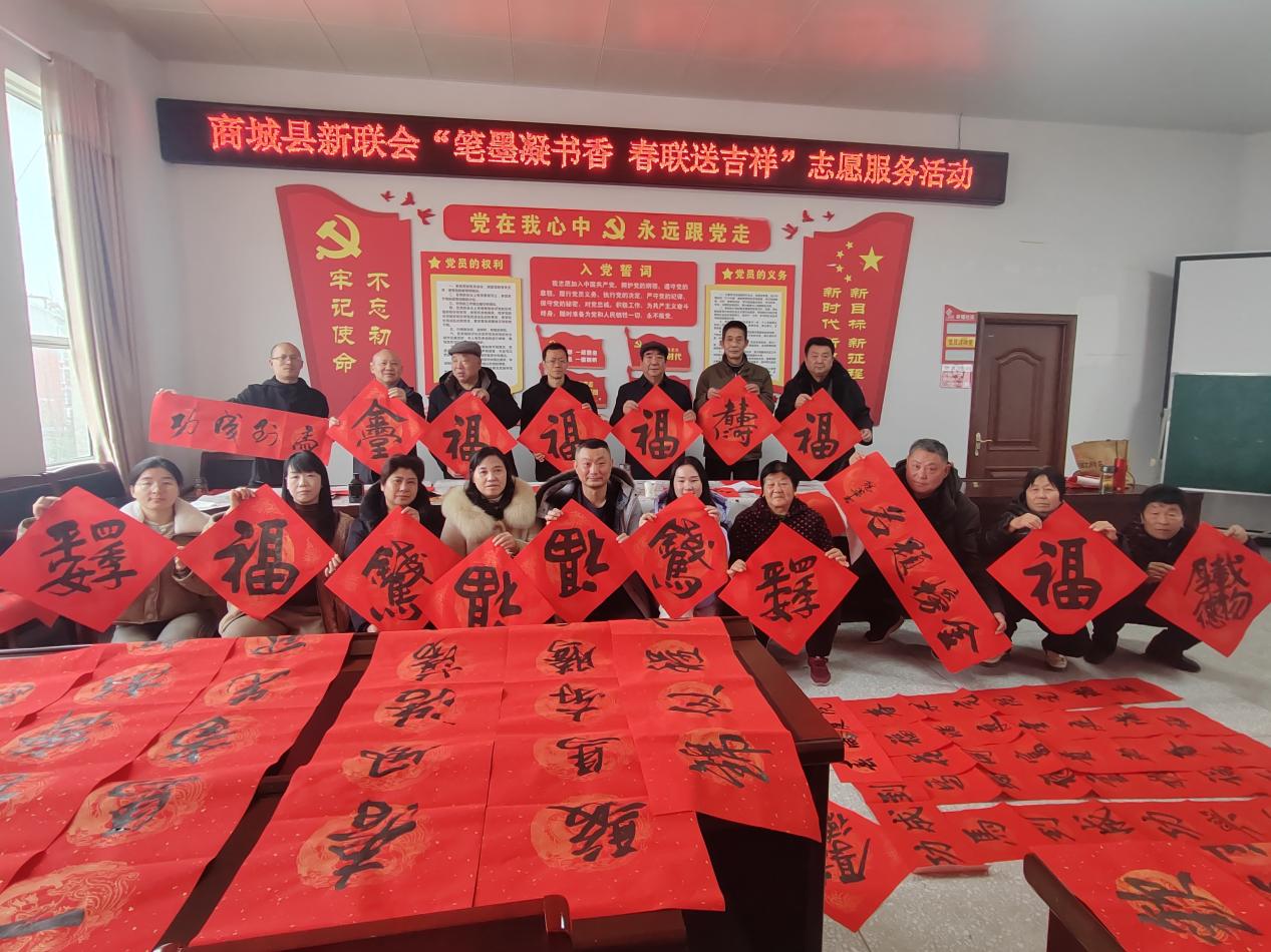 2月3日,商城县新的社会阶层人士联谊会(以下简称“新联会”)组织会员中的书法爱好者走进鲇鱼山街道办事处幸福社区,开展“笔墨凝书香春联送吉祥”志愿服务活动。